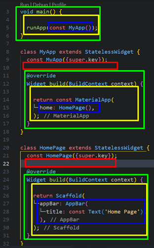 | 3 | Biru | Lingkup UI, dimana intruksi code ui yang sering disebut widget diterapkan. Biasanya diakhiri dengan coma (,). |